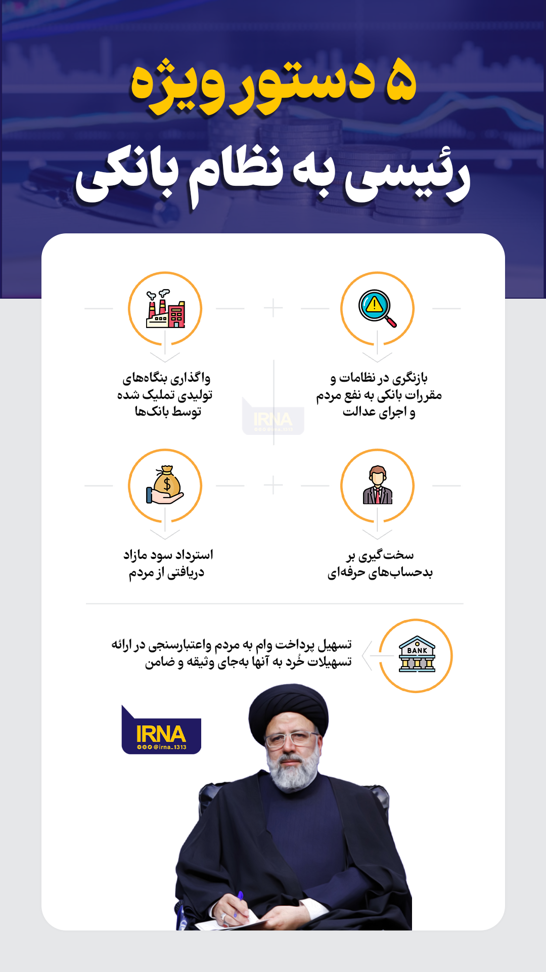 تهران- ایرنا- در این اینفوگرافیک به پنج دستور آیت الله رییسی رییس جمهوری به نظام بانکی اشاره شده است.